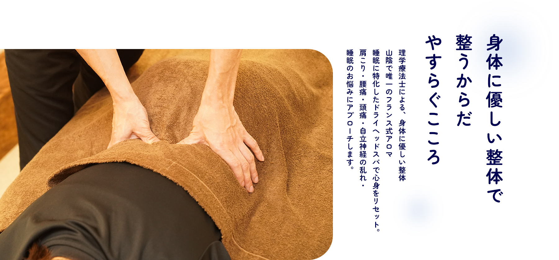 当サロンは、子育てやお仕事を頑張る女性のための、頭痛や肩こりの緩和、そして睡眠の質向上に特化したリラクゼーションサロンです。
