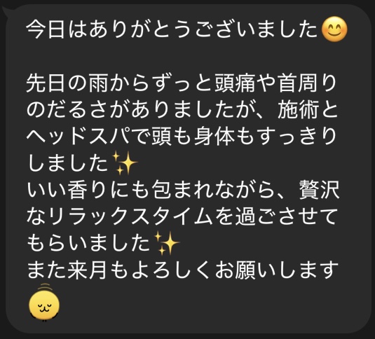 施術後は頭痛の軽減を体感していただけましたし、首・肩の軽さも実感していただけました。