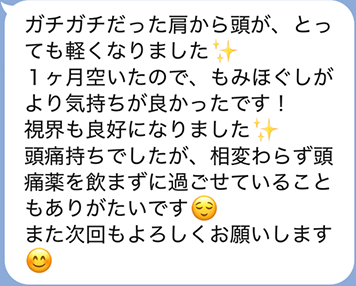 頭の痛みや肩のこりの緩和につながり、服薬をせずに済んだというお声もいただきました。