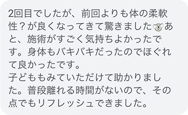 運動機能の専門家である理学療法士の経験を活かし、頭の痛みや肩のこりといった不調を、生活習慣の見直しを含めてサポート。産後だけでなく、女性特有のお悩みにも寄り添います。
